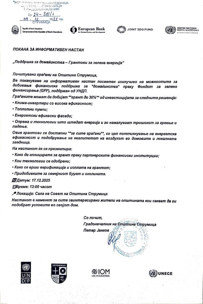Градоначалникот на општина Струмица, Петар Јанков, ве поканува на информативен настан „Поддршка за домаќинства – Грантови за зелена енергија“, посветен на можностите за финансиска поддршка преку Фондот за зелено финансирање и УНДП.